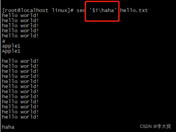 sed '1a\haha' hello.txt