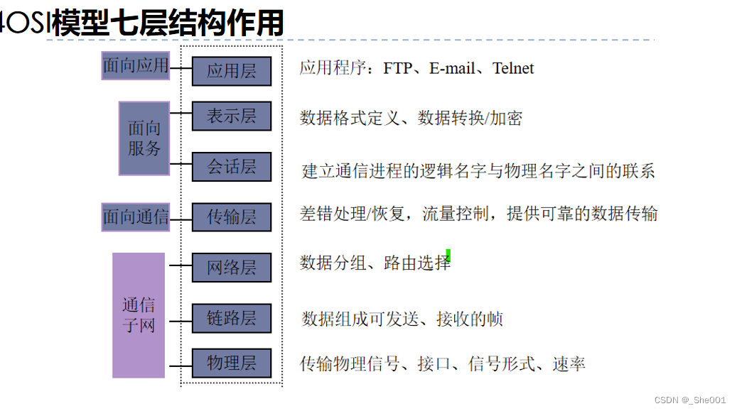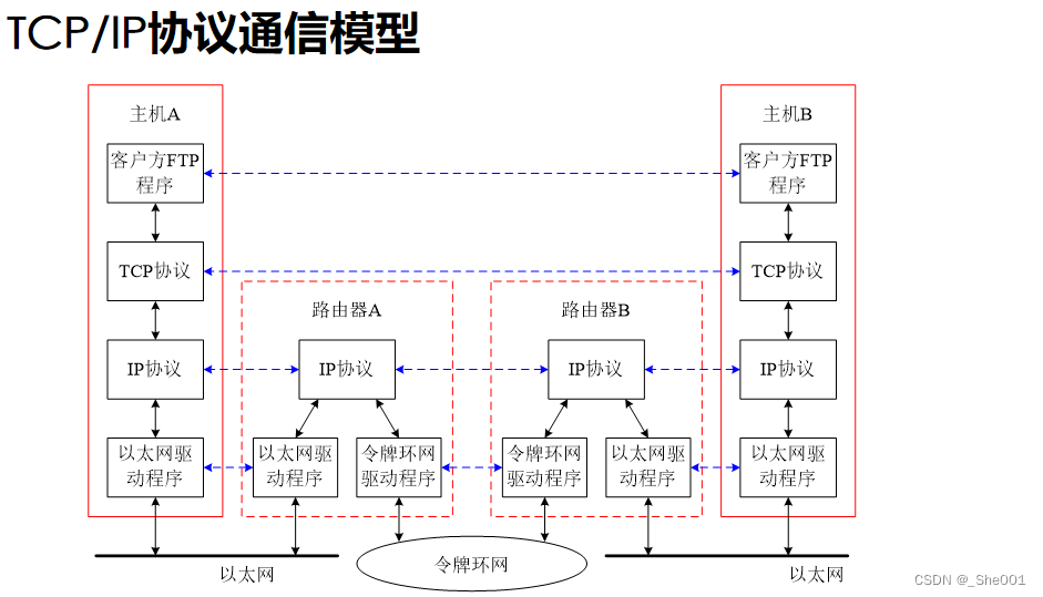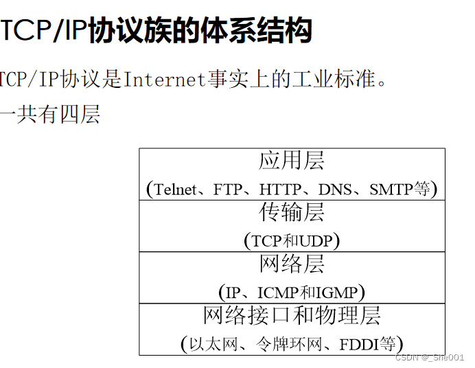 应用层:负责应用程序的网络访问,这里通过端口号来识别各个不同的进程,FTP、TELNET、DNS、SMTP、POP3 协议。