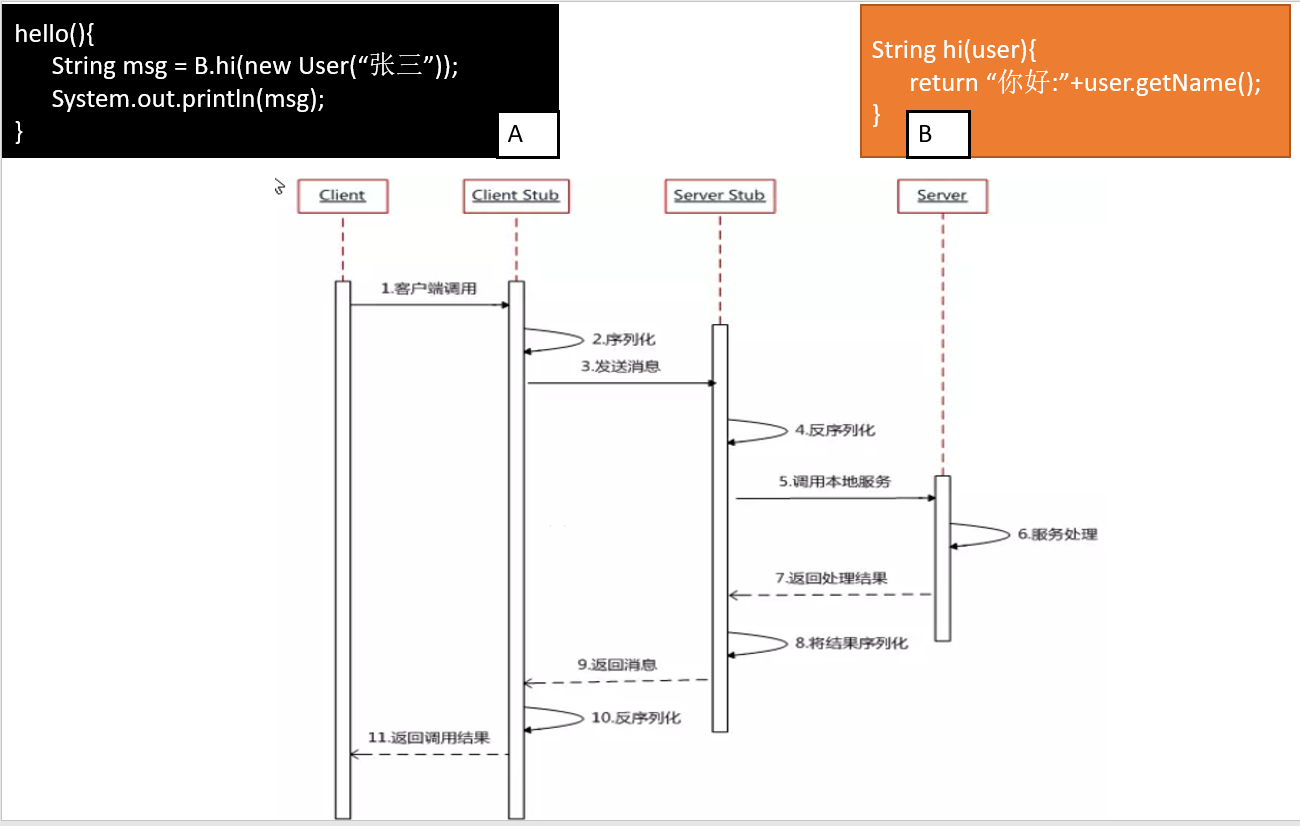 A服务器上有一个hello,想要调用B上的hi方法,同时传入一个User对象,hi方法执行完之后会返回给一个值,A收到返回值打印出来。