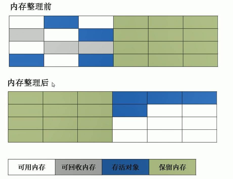 该算法主要是为了解决标记-清除,产生大量内存碎片的问题;当对象存活率较高时,也解决了复制算法的效率问题。它的不同之处就是在清除对象的时候现将可回收对象移动到一端,然后清除掉端边界以外的对象,这样就不会产生内存碎片了。