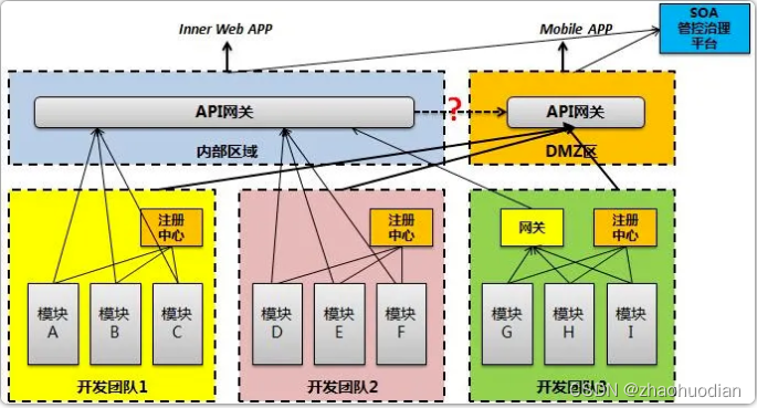 一个独立的开发团队,为保证独立自治,以及内部多个微服务模块间的交互集成,最好启用独立的服务注册中心实现服务注册,发现能力。即开发团队内部多个微服务模块间的集成,不需要通过网关,只需要通过服务注册中心进行集成即可。