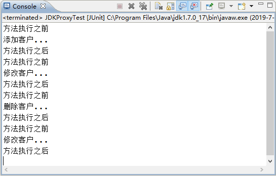 从图 1 的输出结果中可以看出,在调用目标类的方法前后,成功调用了增强的代码,由此说明,JDK 动态代理已经实现。