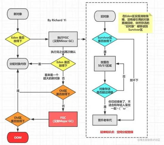 绝大部分对象在Eden区生成,当Eden区装填满的时候,会触发Young Garbage Collection,即YGC。垃圾回收的时候,在Eden区实现清除策略,没有被引用的对象则直接回收。依然存活的对象会被移送到Survivor区。Survivor区分为so和s1两块内存空间。每次YGC的时候,它们将存活的对象复制到未使用的那块空间,然后将当前正在使用的空间完全清除,交换两块空间的使用状态。如果YGC要移送的对象大于Survivor区容量的上限,则直接移交给老年代。