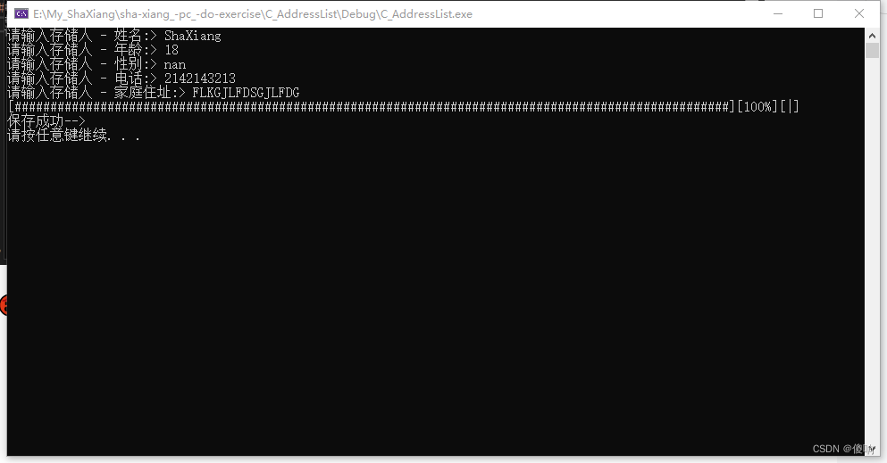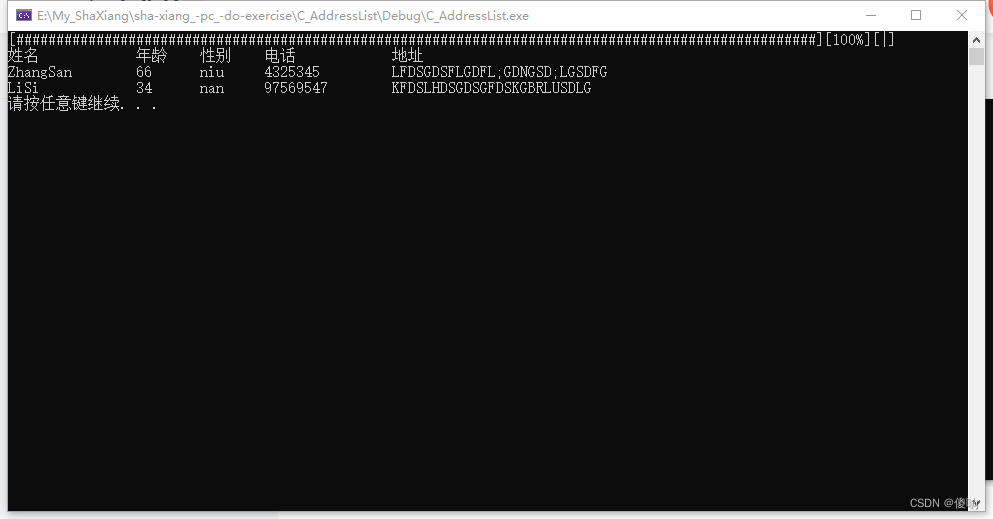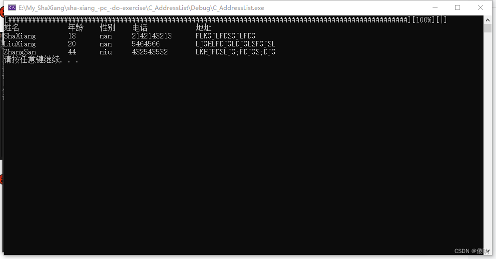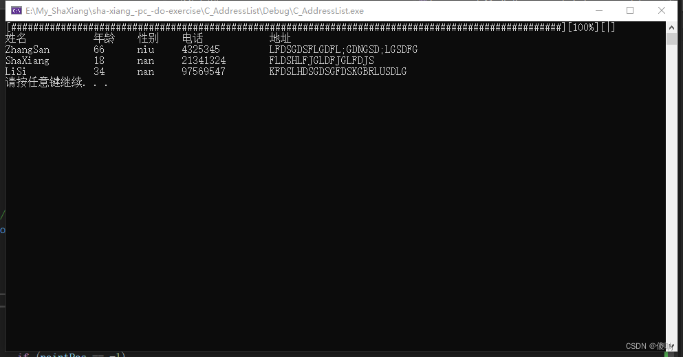这个其实没有什么好说的,将进度条打印的时机放到合适的位置,先打印出格式姓名、年龄、性别、电话、家庭地址的目录,printf上的打印格式是标准的格式,不明白的小伙伴可以区百度查一下哦---🥵