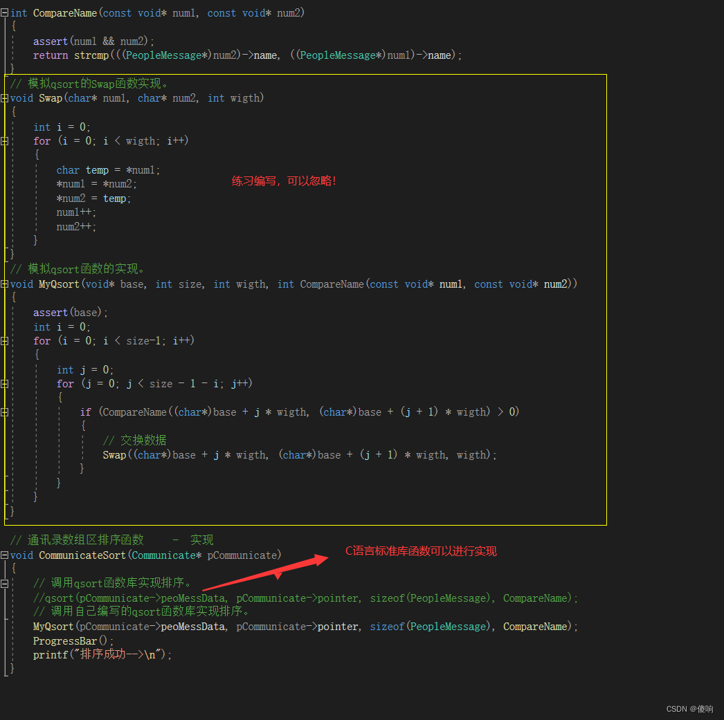 排序函数我们可以调用现成的qsort()库函数来进行实现,当然需要练习的小伙伴也可以按照我上一篇博客自己写一个qsort()模拟实现。