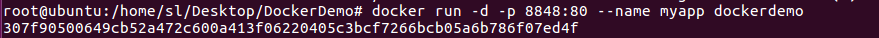 接下来我们输入命令docker run -d -p 8848:80 --name myapp dockerdemo,运行一个容器,名称叫做myapp