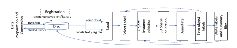 除了商业工具,没有专门的3D点云注释工具,因此,研究界采取了复杂的做法来解决这个问题。例如,都柏林城市数据集使用CloudCompare进行注释,CloudCompare实际上仅用于点云可视化,而不是注释。它的主要功能是将点云划分为若干段,从而对几何复杂的形状进行繁琐的注释,与PC-Annotate不同,CloudCompare也没有适当的标签和统计功能。