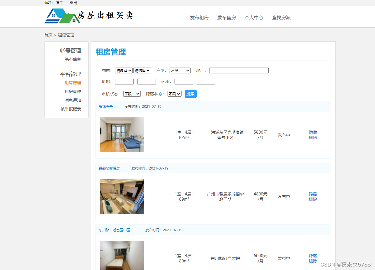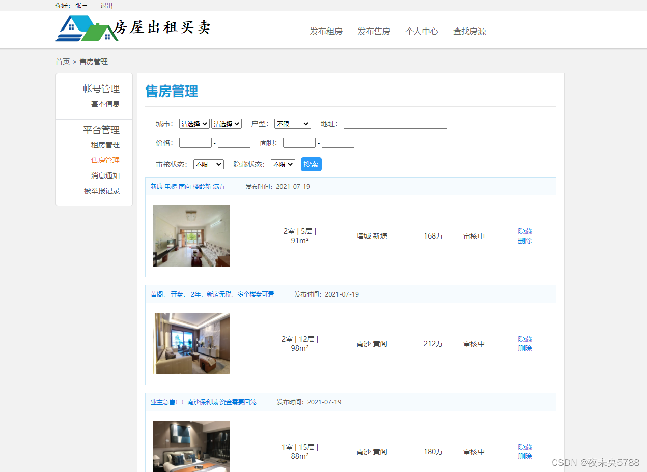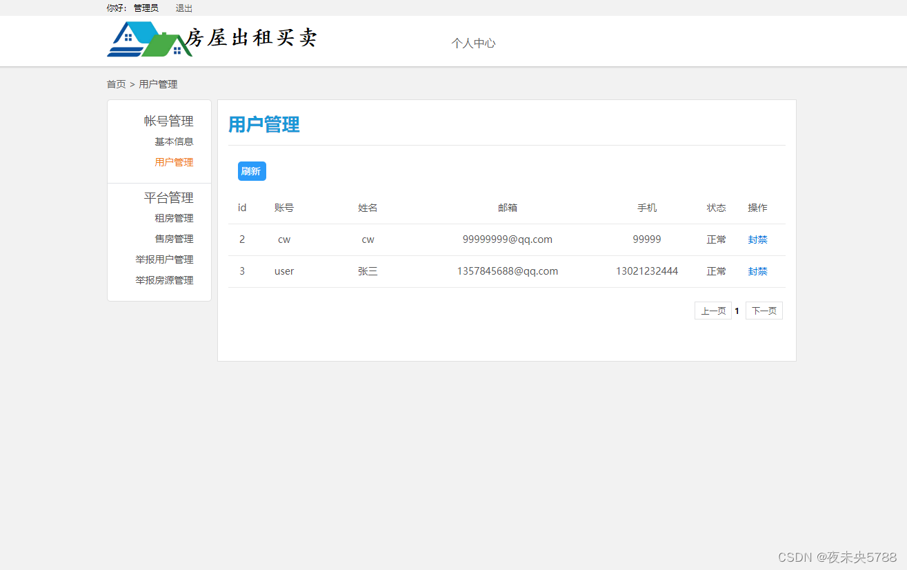 管理员登录,修改基本信息,用户管理,租房管理,售房管理,举报用户管理,举报房源管理等功能。