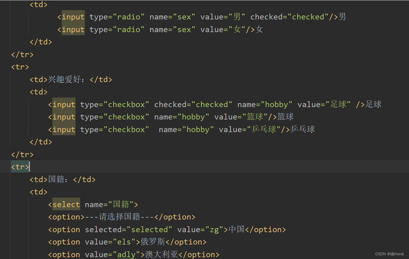 创建一个个人信息注册的表单界面,包括用户名、密码、确认密码、性别(单选)、兴趣爱好(多选)、国籍(下拉列表)、隐藏域、自我评价(多行文本域)、重置、提交