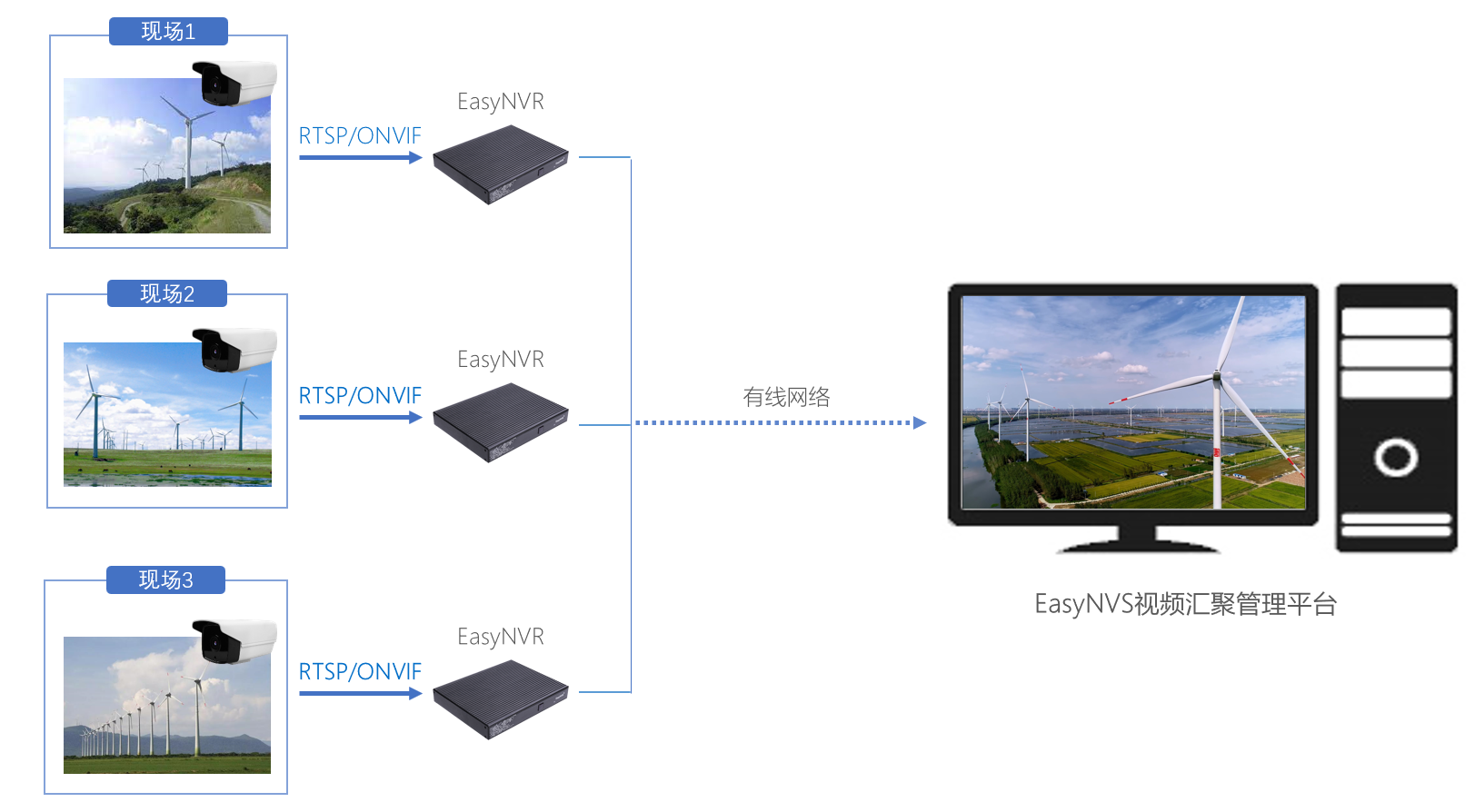 依托EasyNVR+EasyNVS平台的视频监控与运维管理能力,实现对多个风电场的全方位、实时远程视频监控,随时掌握风电场设备运行、安全防范等实时情况,并可同时对多个现场进行实时录像,以便进行事故预防与分析,为风电场内各设施的安全运行提供保障手段,打造风电场“无人值班、少人值守”的高效运营模式。