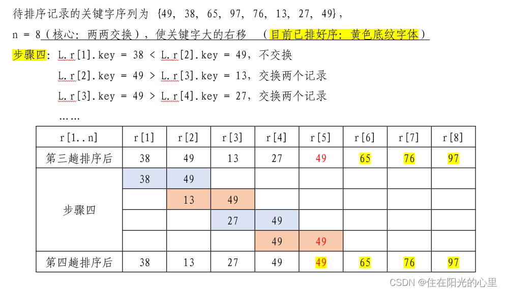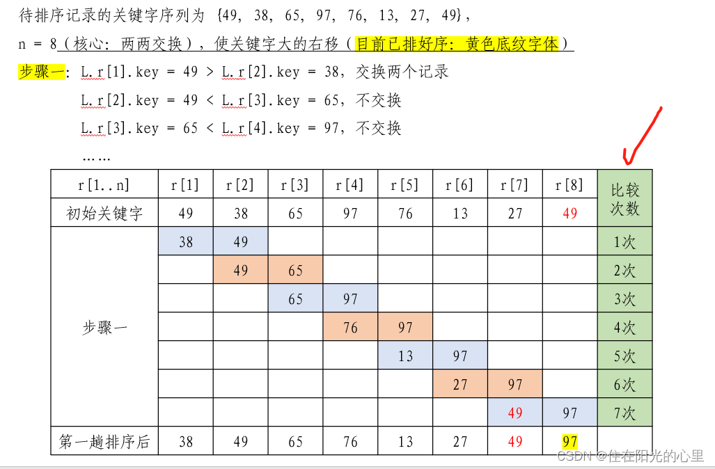 首先将第一个记录的关键字和第二个记录的关键字进行比较,若为逆序( 即 L.r[1].key > L.r[2].key ),则交换两个记录。然后比较第二个记录和第三个记录的关键字。依次类推,直至第 n - 1 个记录和第 n 个记录的关键字进行过比较为止。