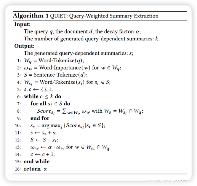 本文提出QUery-WeIghted Summary ExTraction (QUIET)算法,使用原理有点类似MMR的方式,可以快速高效的从document里提取出3-5句sentence组成的摘要
