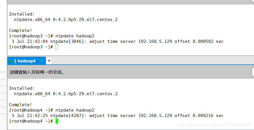 最后说下时间同步,如果时间不同步的话,会导致拷贝的进程速度不一样,是拷贝两个的文件出现断裂,断档,也就是说当同时拷贝某文件时,每台虚拟机时间时不一样的,一台时间快,一台时间慢,时间不对等会得不到响应,慢的那台会觉得时间没到响应的时间,所以为了不让这种情况发生,必须让集群的时间同步。