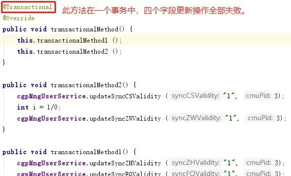 第一点要注意的就是在@Transactional注解的方法中,再调用本类中的其他方法method2时,那么method2方法上的@Transactional注解是不!会!生!效!的!但是加上也并不会报错,拿图片简单帮助理解一下吧。这一点也是面试中会问到的事务失效的场景。