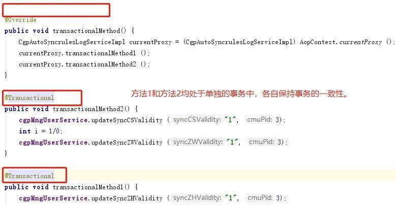 小结只要方法transactionalMethod上有注解,并且方法1和方法2都处于当前事务中(不使用代理调用,方法1和方法2上的@Transactional注解是不生效的;使用代理,需要方法1和方法2都处在transactionalMethod方法的事务中,默认或者嵌套事务均可,当然也可以不加@Transactional注解),那么整体保持事务一致性。