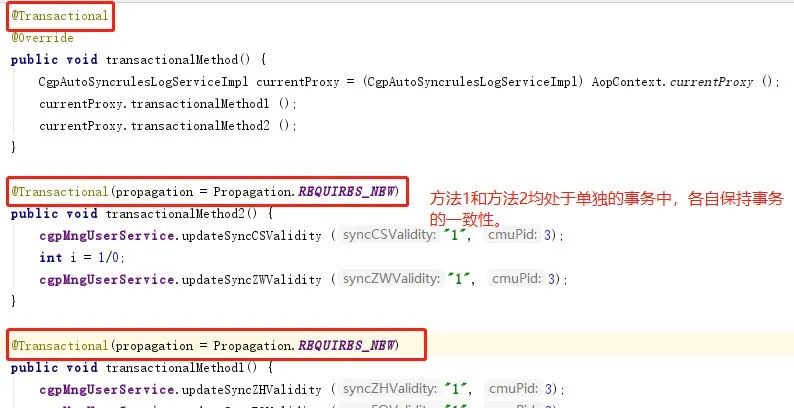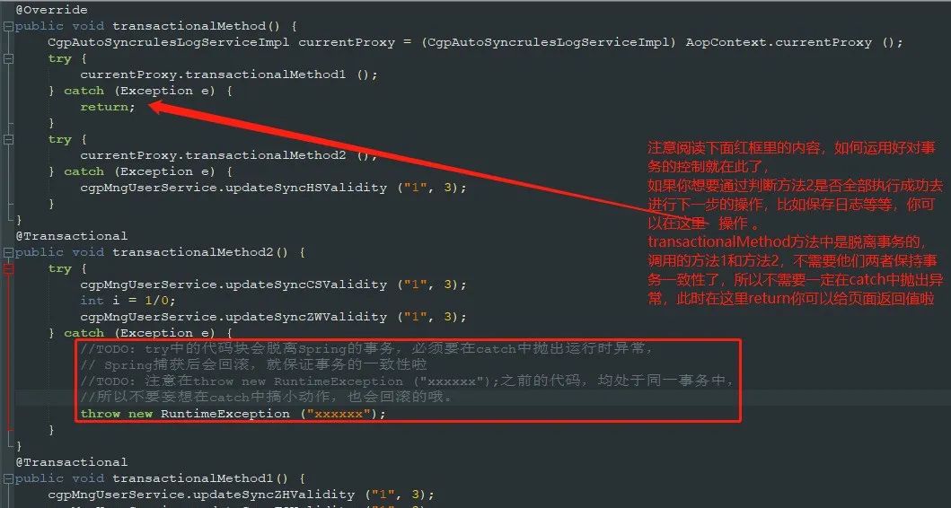 代码太长了,超过屏幕了,粘贴出来截的图,红框注释需要仔细看,希望不要影响你的阅读体验,至此,本篇关于@Transactioinal注解的使用就到此为止啦,