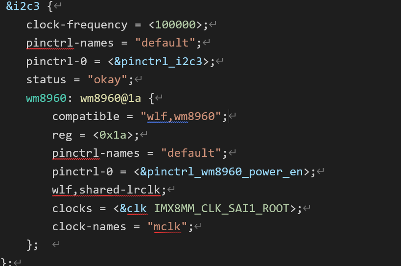 在I2C3下添加wm8960节点,挂载到哪个I2C就把设备节点放到对应I2C下,修改 clocks= <&clk IMX8MM_CLK_SAI1_ROOT>,在I2C3下有了设备节点,但是时钟需要改成sai1的。