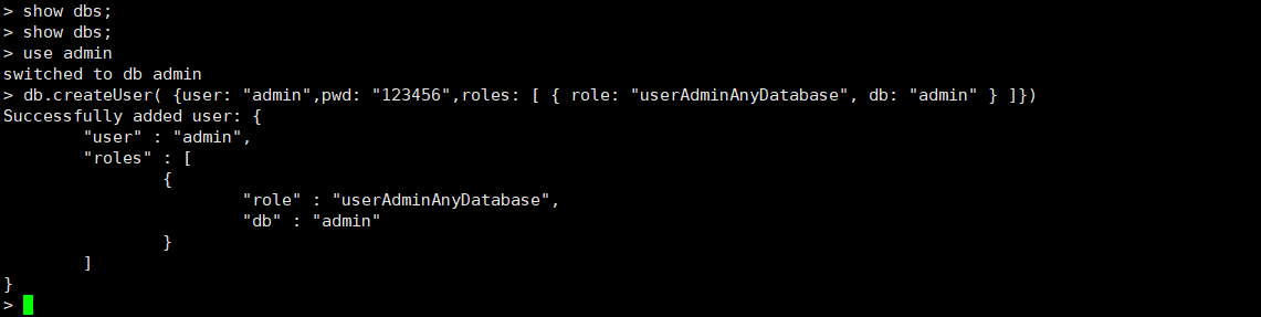 db.createUser( {user: "admin",pwd: "123456",roles: [ { role: "userAdminAnyDatabase", db: "admin" } ]})