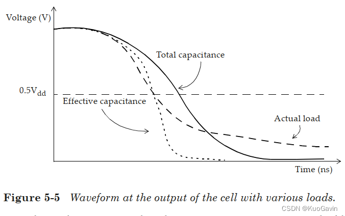 有效电容法试图找到一个可以用作等效负载的电容,以使原始设计与具有等效电容负载的设计在单元输出的时序方面表现一致。这个等效电容被称为有效电容(effective capacitance)。