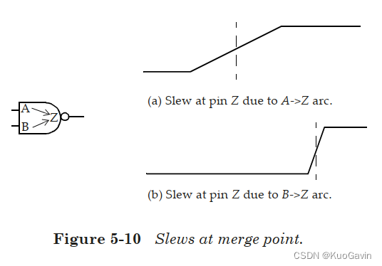 当多个压摆到达一个公共点时(例如在多输入单元的情况下)会发生什么呢?这种公共点称为压摆合并点(slew merge point)。 选择哪个压摆在压摆合并点处继续向下传播呢?考虑图5-10所示的两输入单元。