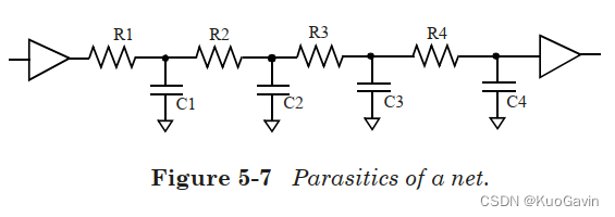 C 1 C_1 C1表示近端电容, C 2 C_2 C2表示远端电容,如图5-4(b)中所示。 k k k的值介于 0 0 0和 1 1 1之间。在互连电阻可忽略的场景下,有效电容几乎等于总电容。这可用图5-4(b)中将 R w i r e R_{wire} Rwire设置为 0 0 0来直接解释。类似的,如果互连电阻相对较大,等效电容几乎等于近端电容 C 1 C_1 C1(图5-4(b))。这可用将 R R R增加至限制的情况,将 R R R变为无穷大(本质是断路电路)。