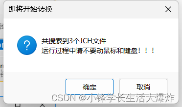 - confirm = pyautogui.confirm(title="即将开始转换", text=f"共搜索到{len(jchs)}个JCH文件\n运行过程中请不要动鼠标和键盘!!!", buttons=['OK', 'Cancel'])