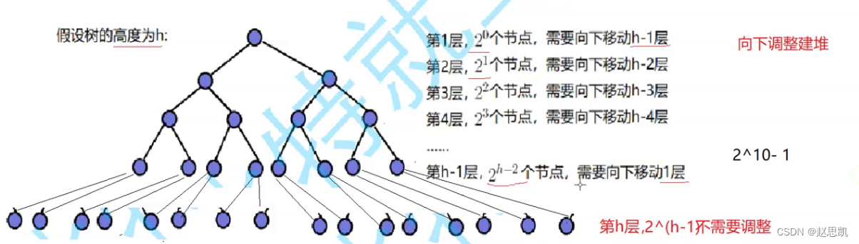 向上调整建堆的时间复杂度为O(N*logn),原因是我们循环N次,2^m-1=N,求出m大概等于logN,m就是高度,我们每一个运算执行的次数就是m-1次,所以向上调整建堆的时间复杂度为O(N*logn).