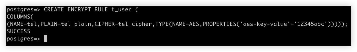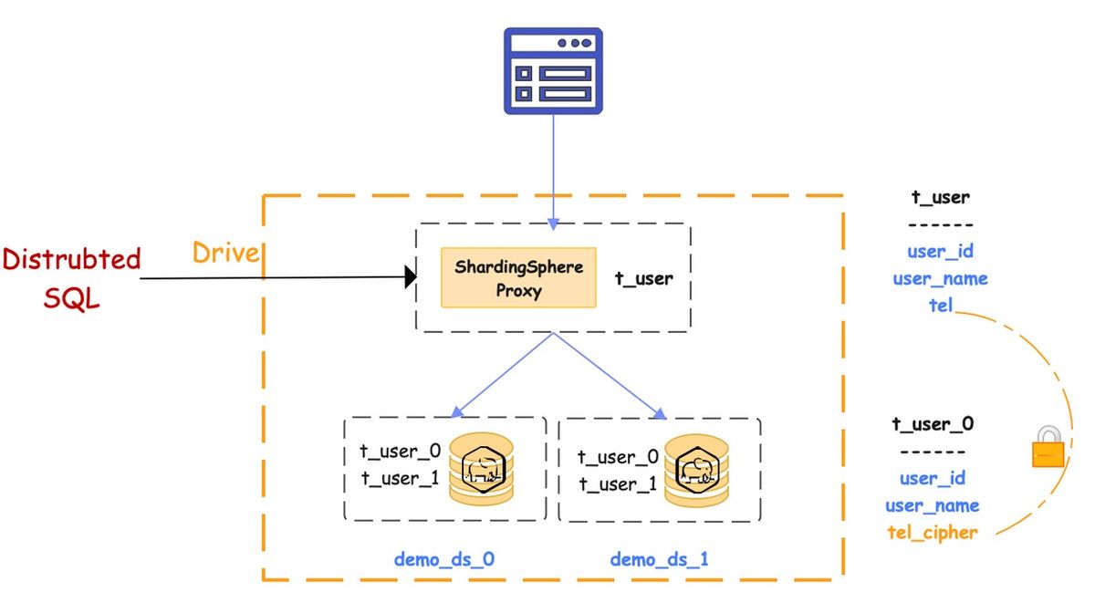 ShardingSphere-Proxy executes all of these processes in the background, greatly simplifying your life as a user, only requiring you to deal with the logic table t user with a logic column tel. However, before running a SQL query, users shall guide ShardingSphere on how to shard and encrypt data.
