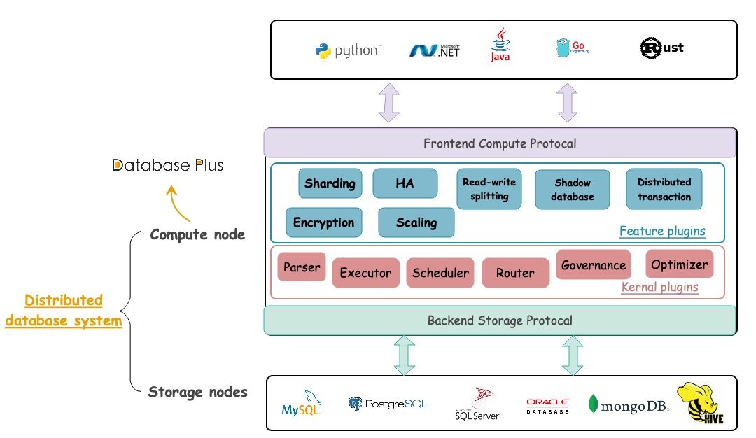 This means that a Database Plus based database system is adaptable and "pluggable", simplifying the combination of multiple feature plugins for end users. ShardingSphere currently supports sharding, read/write splitting, database gateway, data encryption, distributed privileges, shadow database, and other features.