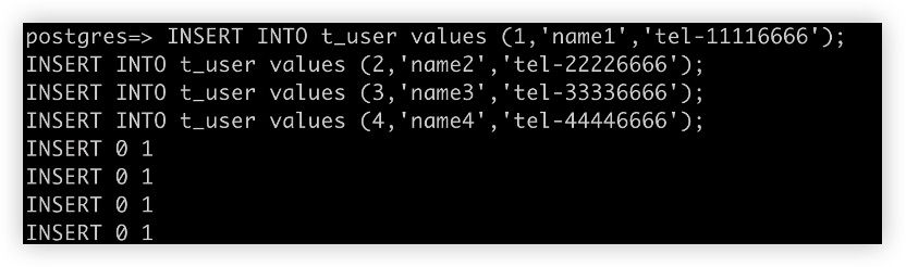 The application considers ShardingSphere + PostgreSQL instances to be a distributed database and treats ShardingSphere similarly to PostgreSQL. From the user perspective, there is only one logic table, namely t_user. However, this table is made up of four actual tables, from t_user_0 to t_user_3, which are located in two different PostgreSQL instances.