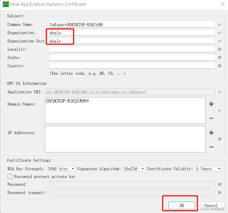 (2)在UaExpert里输入组织和单位,随便输入即可,单击确认。