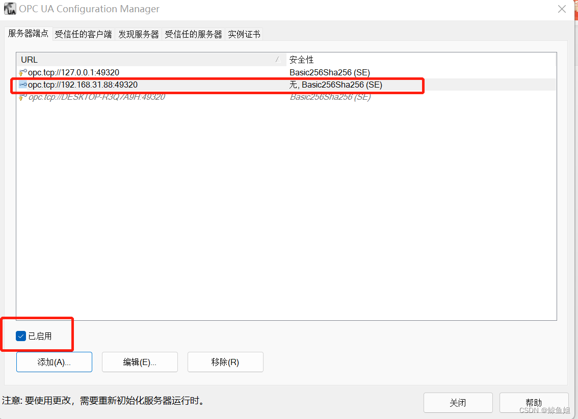 (2)单击添加,选择网络适配器,安全策略无,得到opc.tcp://192.168.31.88:49320,单击确认就可以