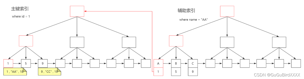 对于主键默认会创建主键索引,其他列创建的索引就叫辅助索引,也叫二级索引,辅助索引的叶子节点存储的是主键索引的键值,这就意味着辅助索引需要查询两个B+Tree.