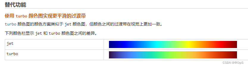 c = turbo 以三列数组形式返回 turbo 颜色图,该数组包含的行数与当前图窗的颜色图相同。如果不存在图窗,则行数等于默认长度 256。数组中的每一行包含一种特定颜色的红、绿、蓝强度。强度值在 [0,1] 范围内,颜色方案与 jet 颜色方案相似,但颜色之间的转换在感觉上比 jet 更柔和。颜色方案如下图所示。