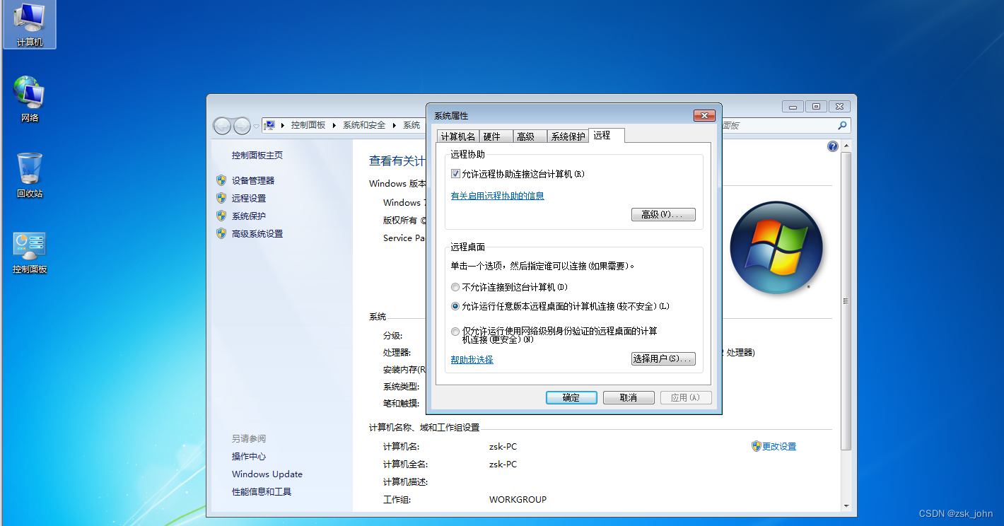 我的电脑右键---->远程设置---->远程 选择远程桌面的第二个 ,选择较不安全那个