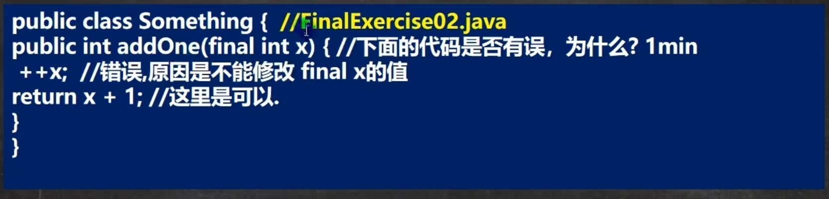 final class AAA{ public final void cry(){ } }我们可以看这个类,这个类用final进行修饰了,可是方法又用final进行修饰,这个地方就有点"画蛇添足",既然类已经不能被继承了,那别人也不可能去重写方法,别人都继承不了我们的类,更不可能重写里面的方法,所以我们在方法这再加一个final,没有什么意义。