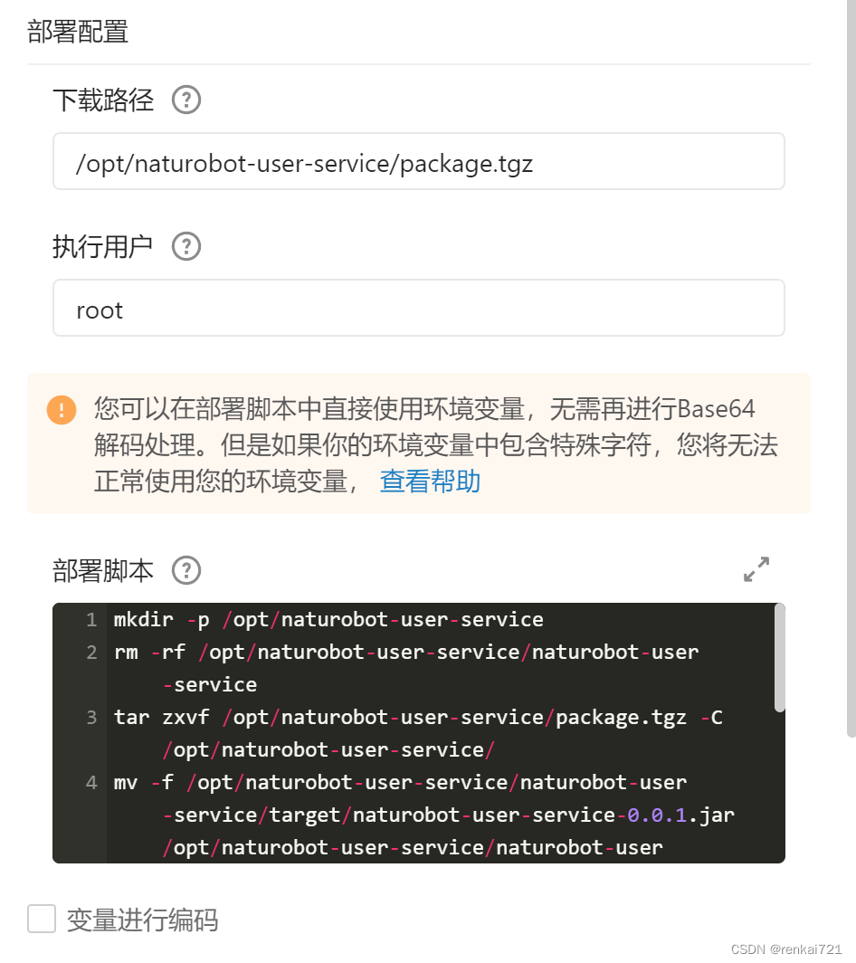 7、主机部署,这里就比较简单,如果配置主机组的时候什么ECS也看不到,那可能是你的RAM没有权限。找一个权限大一点的帐号或者分配一个权限。然后就是下载路径就是自己的ECS上的路径,想部署在哪里就写自己的文件夹地址就可以了。执行用户就是ROOT,不需要修改。比较重要的就是下面的部署脚本,需要懂得基础的linux命令。