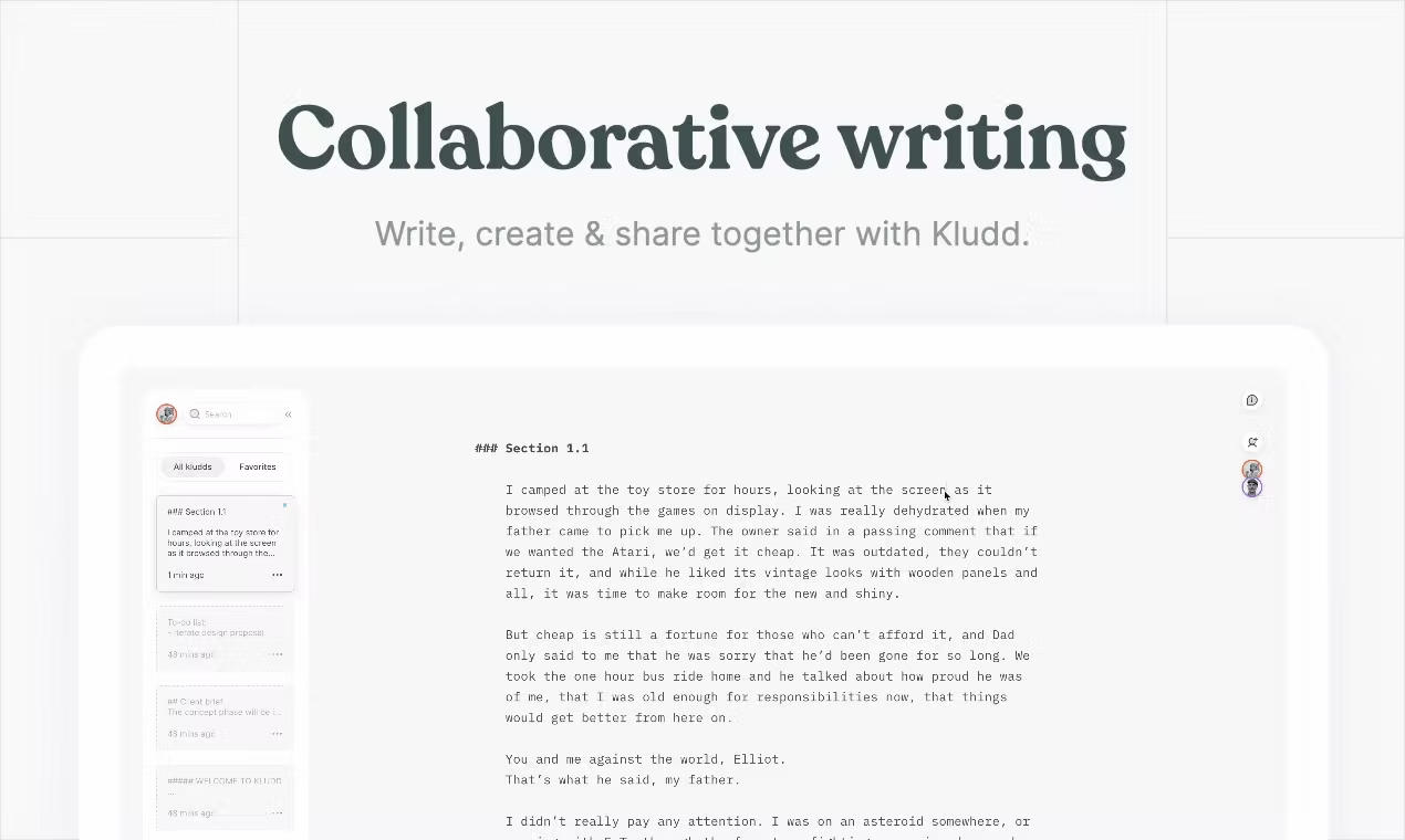 11. kludd - 这是一个协同写作工具,可以实现多人在线同时写作,这个产品的定位不是用来协同办公的,是真的写作。用来写剧本、小说、故事、散文或诗歌。设计的是真的好看。但是这个定位不知道有多少人有这个需求。