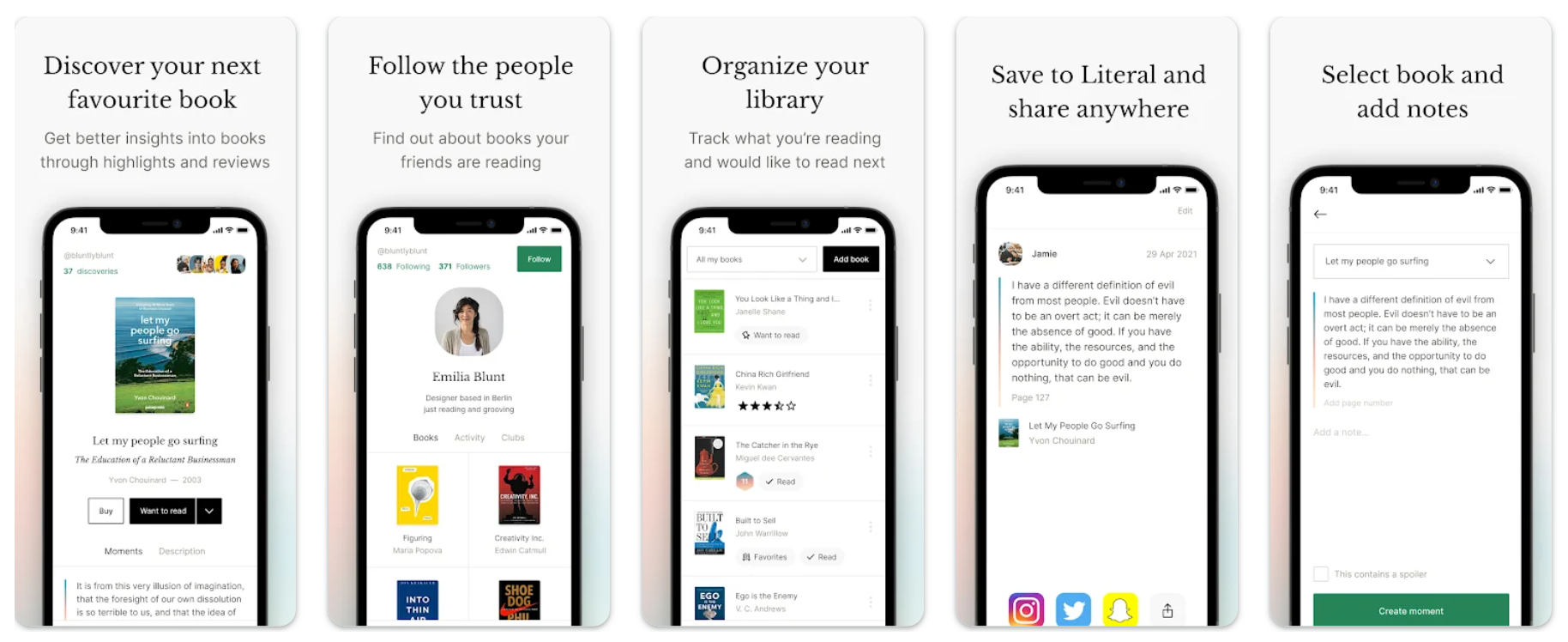 9. Literal - 这是一款用于发现、整理和讨论书籍的应用,主要是社区分享,借此机会与志同道合的读者互动,获得推荐。产品做的很完整简洁好看,支持多端,Web,iOS,Android。