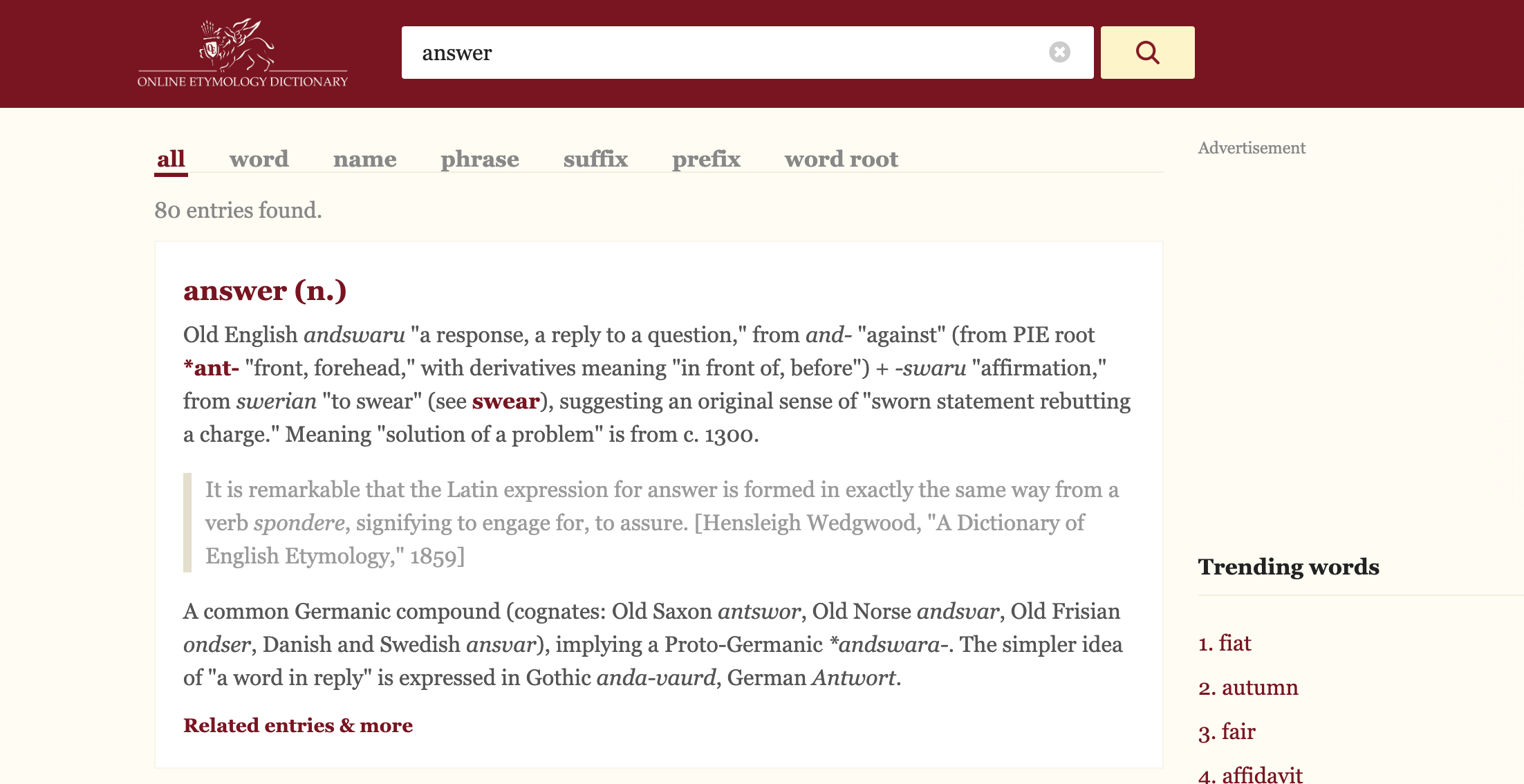 4. 英文词源数据库 - 这个网站可以查询每个英语单词的历史和含义。很有用的一个工具,可以发现一些很有趣的解释。