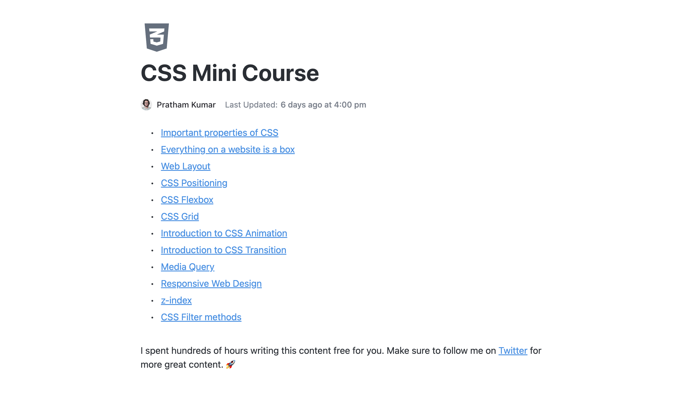 1. CSS Mini Course - 作者@Pratham Kumar 为初学者整理了这个基于 Twitter 的免费 CSS 课程。
