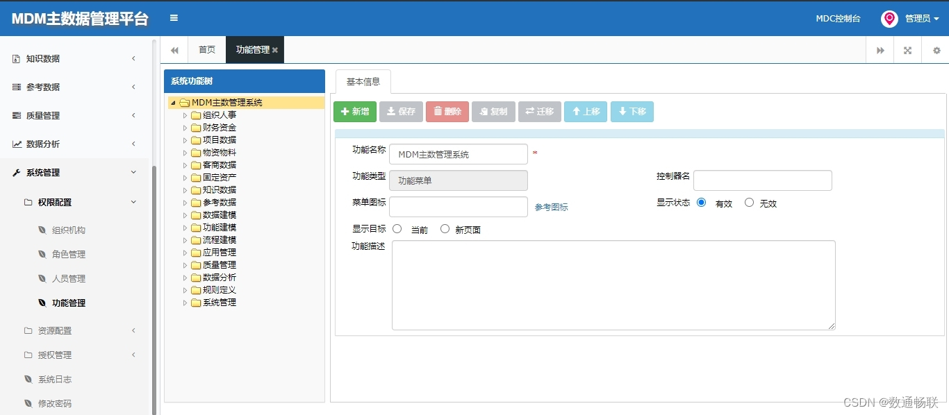 功能授权一共包含三部分,分别是菜单授权、页面授权以及操作授权,菜单指的是主数据平台左侧菜单树、页面授权指的是控制器列表、操作授权指的是按钮权限配置。