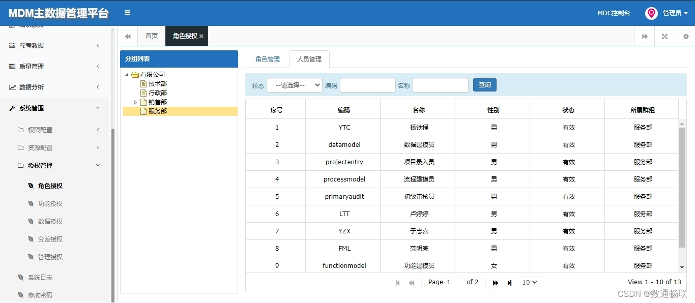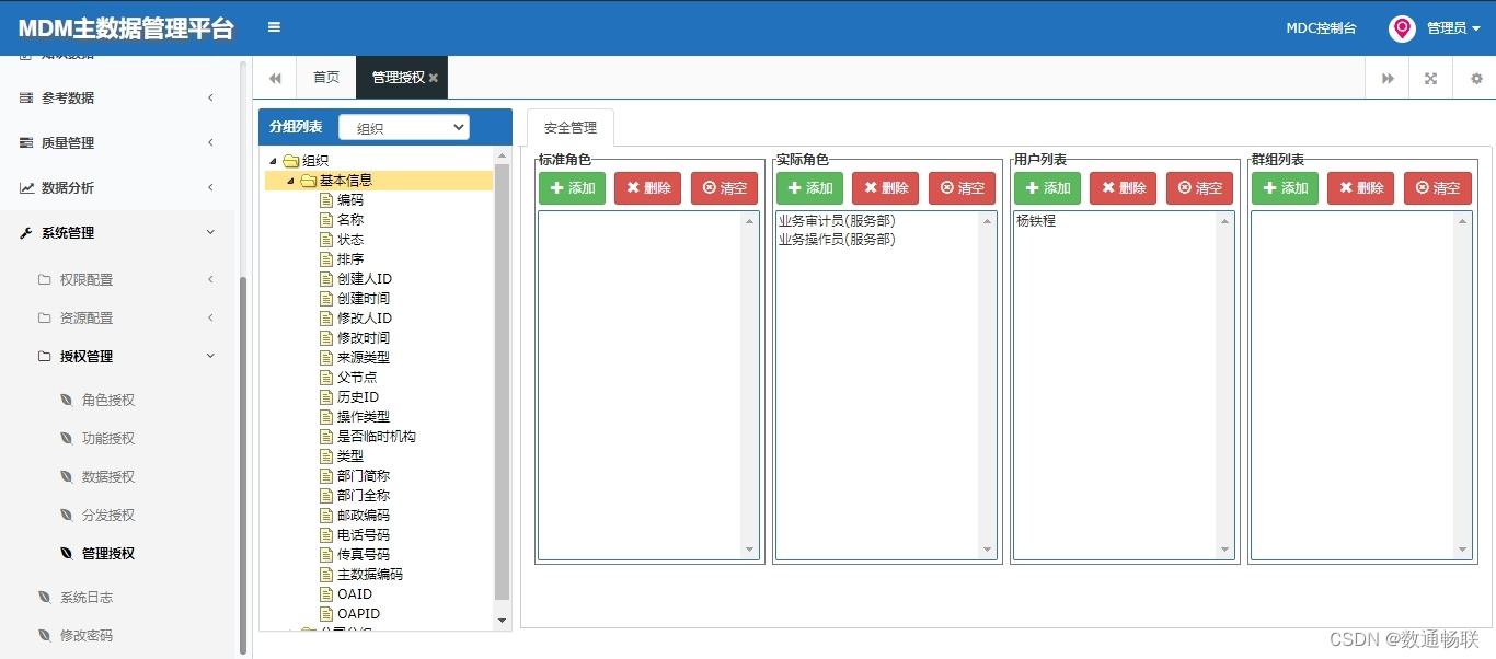 授权管理部分实际上对主数据目前所有的权限配置功能进行了整合,例如角色和人员管理以及相互之间的关联,主数据数据分组授权以及分发权限,左侧功能菜单树的授权,页面的权限配置以及按钮的操作权限等。同时,也在此基础上添加了一些新的权限配置使整体的业务逻辑更顺畅,例如,根据主数据属性去配置分发权限,来满足不同业务场景下的需求。