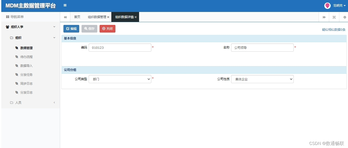 1.该页面为操作人员账号下,组织主数据的详情页面,该主数据配置了编码、名称、公司类型和公司性质四个属性权限。