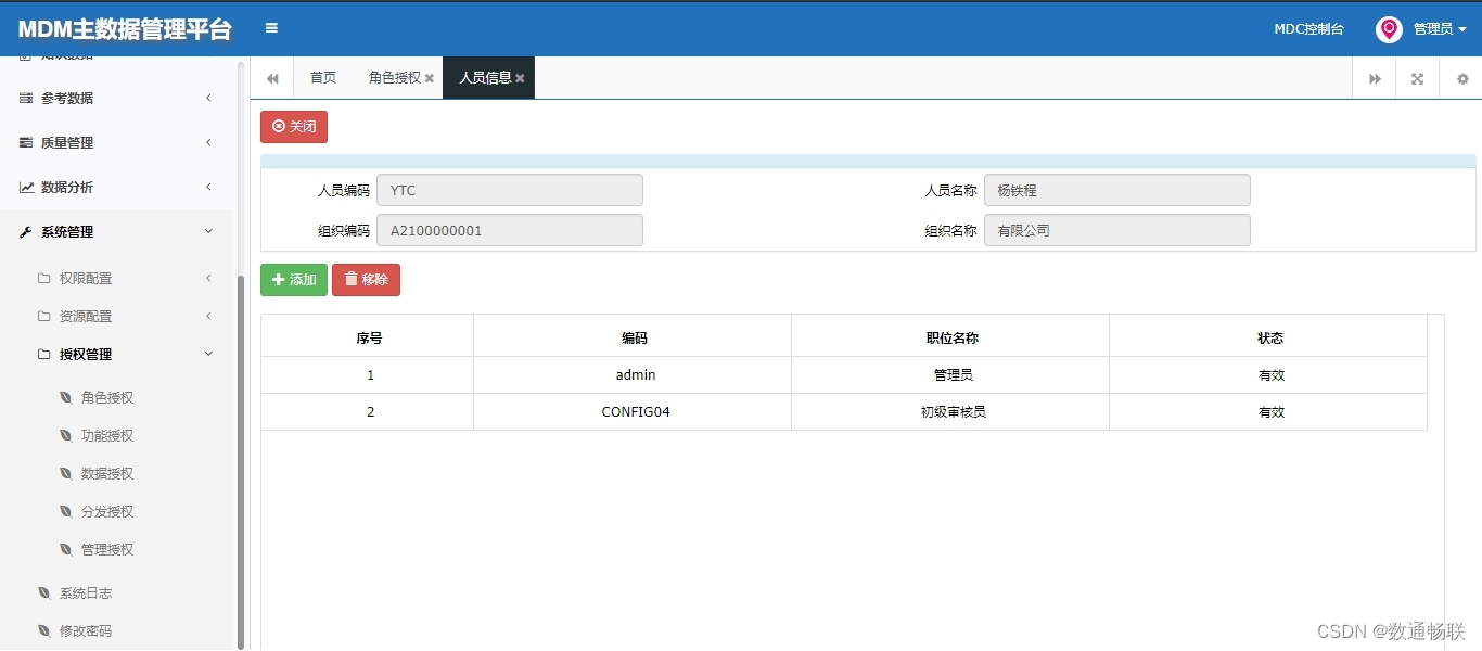 人员同理,可以通过左侧组织树查看不同组织下的人员,也可以根据编码、名称、状态去过滤人员数据,双击一条数据进入到人员信息编辑页面,上方是人员编码和名称以及组织编码和组织名称;下方是该人员下关联的角色信息,除了查看角色也可以添加和移除角色,同样,这里的添加和移除也不是新增一个新的角色或者说是删除一个角色,而是操作角色与人员的关联关系,也就是给人员关联角色,移除的同样也是这种关联关系。