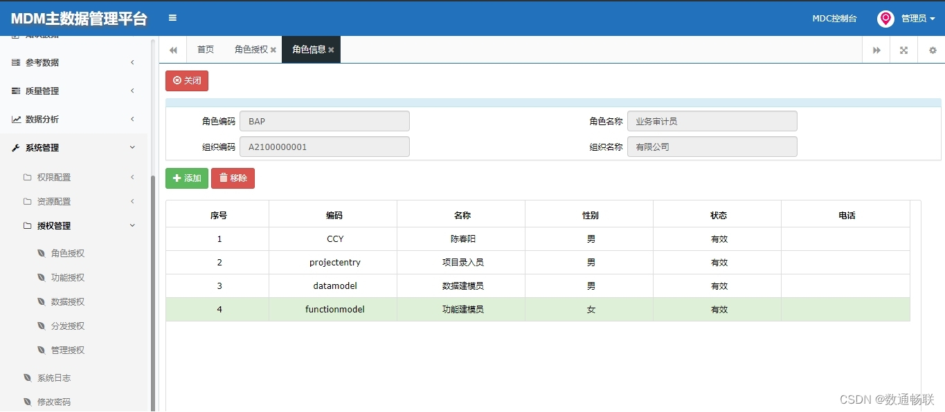 通过左侧组织树可以查看不同组织下的角色信息,也可以根据编码、名称等过滤角色数据,双击一条数据进入到角色信息编辑页面,上方是角色编码和角色名称以及组织编码和组织名称;下方是该角色下关联的人员信息,除了查看关联的人员信息,也可以添加、移除人员数据,这里的添加和移除并不是新增一个新的人员或者说是删除一个人员,而是操作角色与人员的关联关系,也就是给角色关联人员,移除的同样也是这种关联关系。