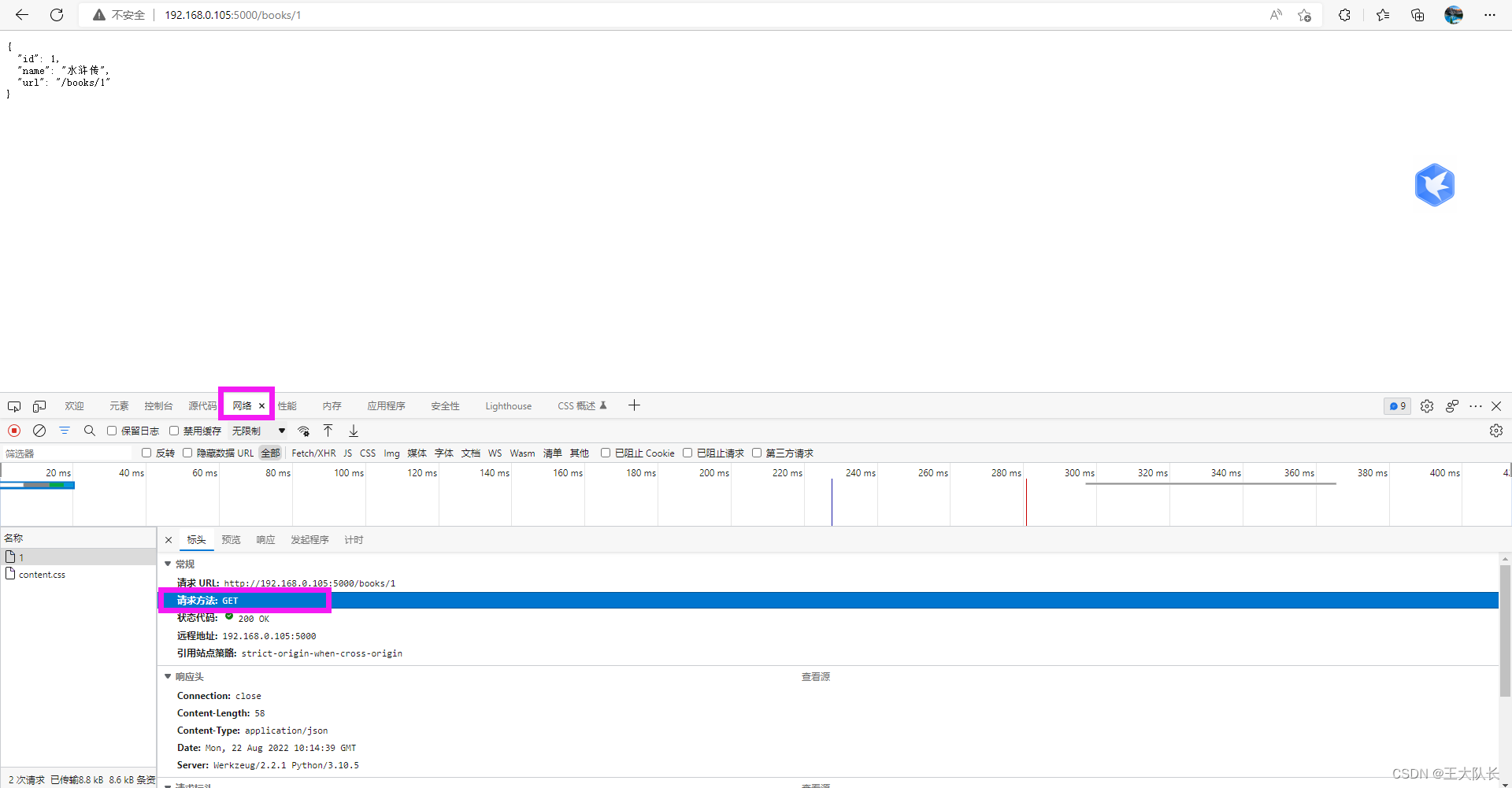 我们将methods参数赋值为['GET'],进入books/1界面,右键点击检查,点网络,再刷新下: