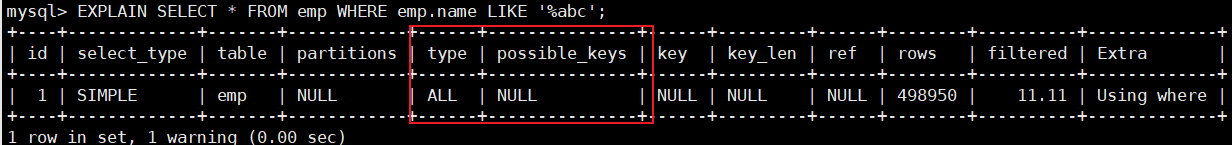 EXPLAIN SELECT * FROM emp WHERE emp.name LIKE '%abc'; 不能使用索引