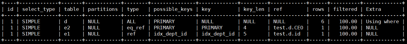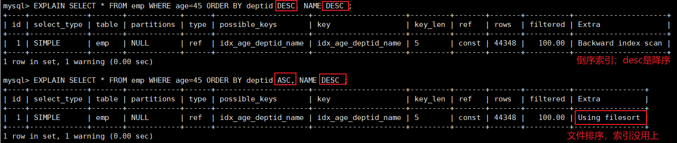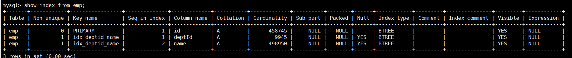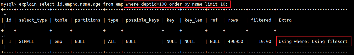 EXPLAIN SELECT * FROM emp WHERE emp.deptid=1 AND emp.name = 'abcd';
