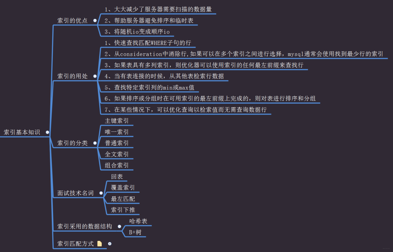 索引是帮助MySQL高效获取数据的数据结构。一个数据库表可以建立多条索引。(字典中的目录)